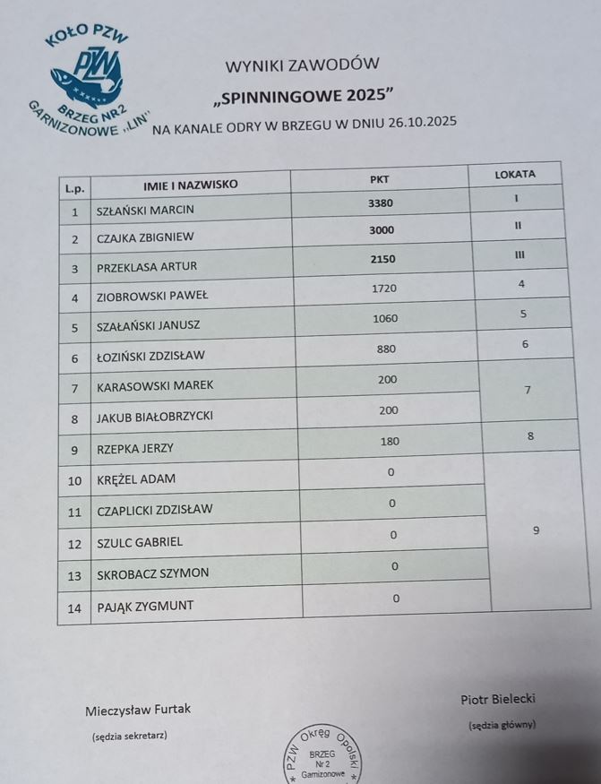 Tak przedstawia się klasyfikacja zawodów Spinningowych: